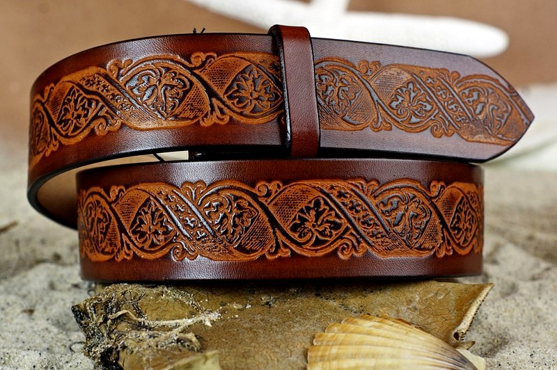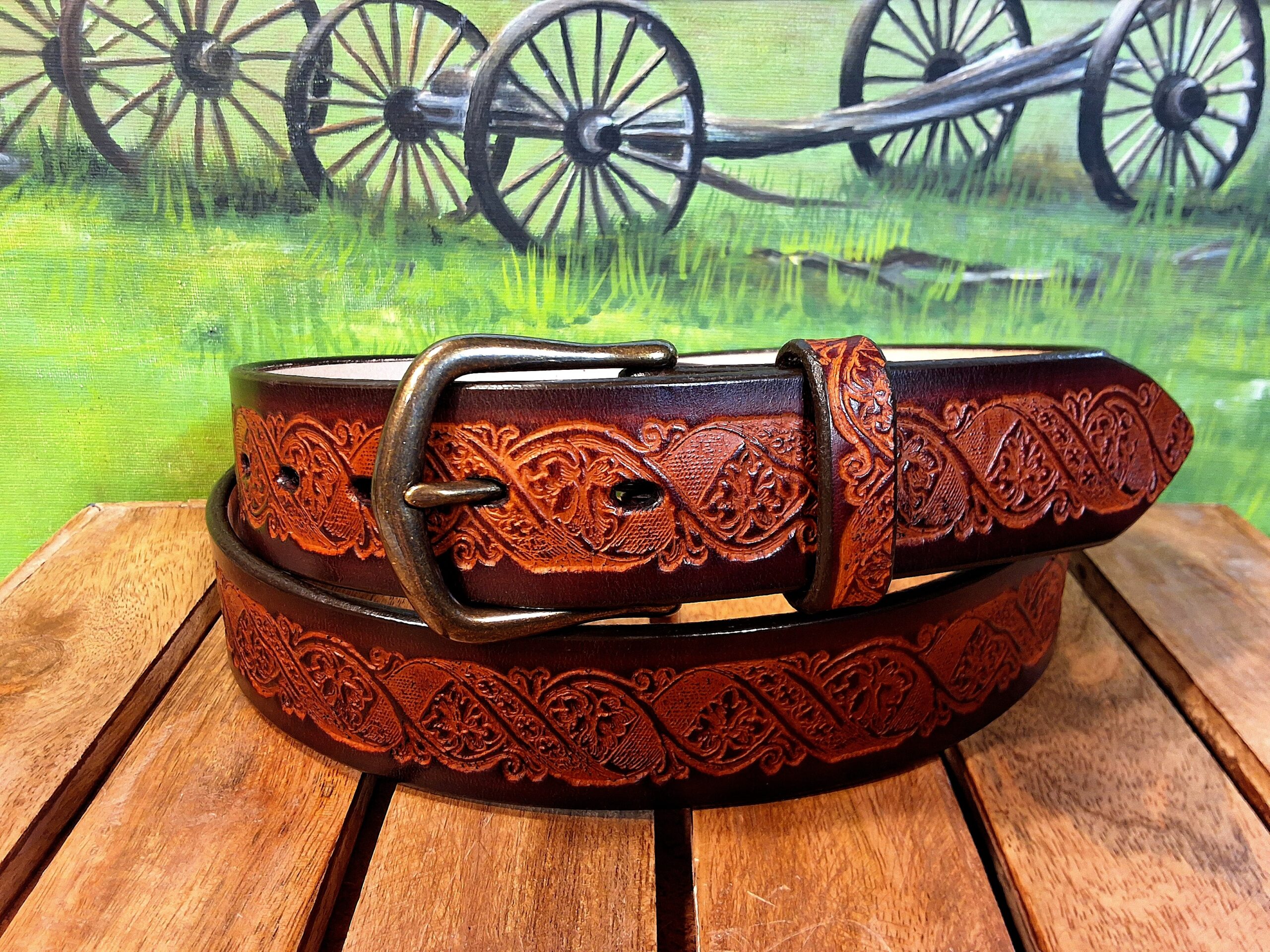 Our Floral Vine Embossed Leather Belt is locally handcrafted, antique hand dyed and shown in a two tone hand dye effect.