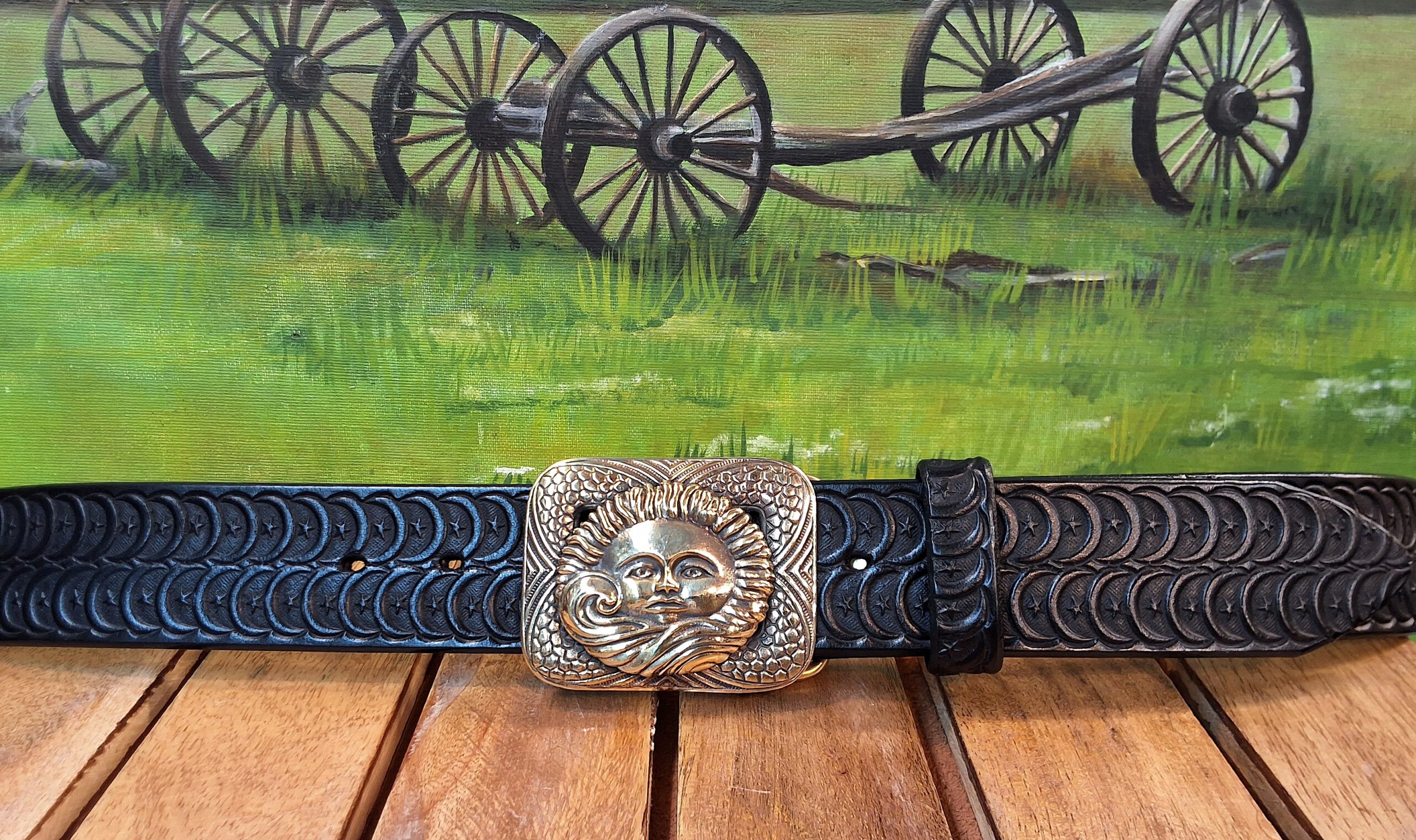 Our unique handcrafted Two Moons Embossed Leather Belt is Artisan fine quality bench crafted and handmade in up to a 1-1/2″ premium full grain natural veg tanned Spanish Splenda Bridle leather.
