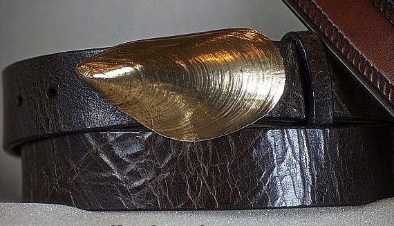 features a locally handcrafted 1-1/4″ width Mussel Shell Buckle featured in solid brass, white bronze silver or red bronze metal.