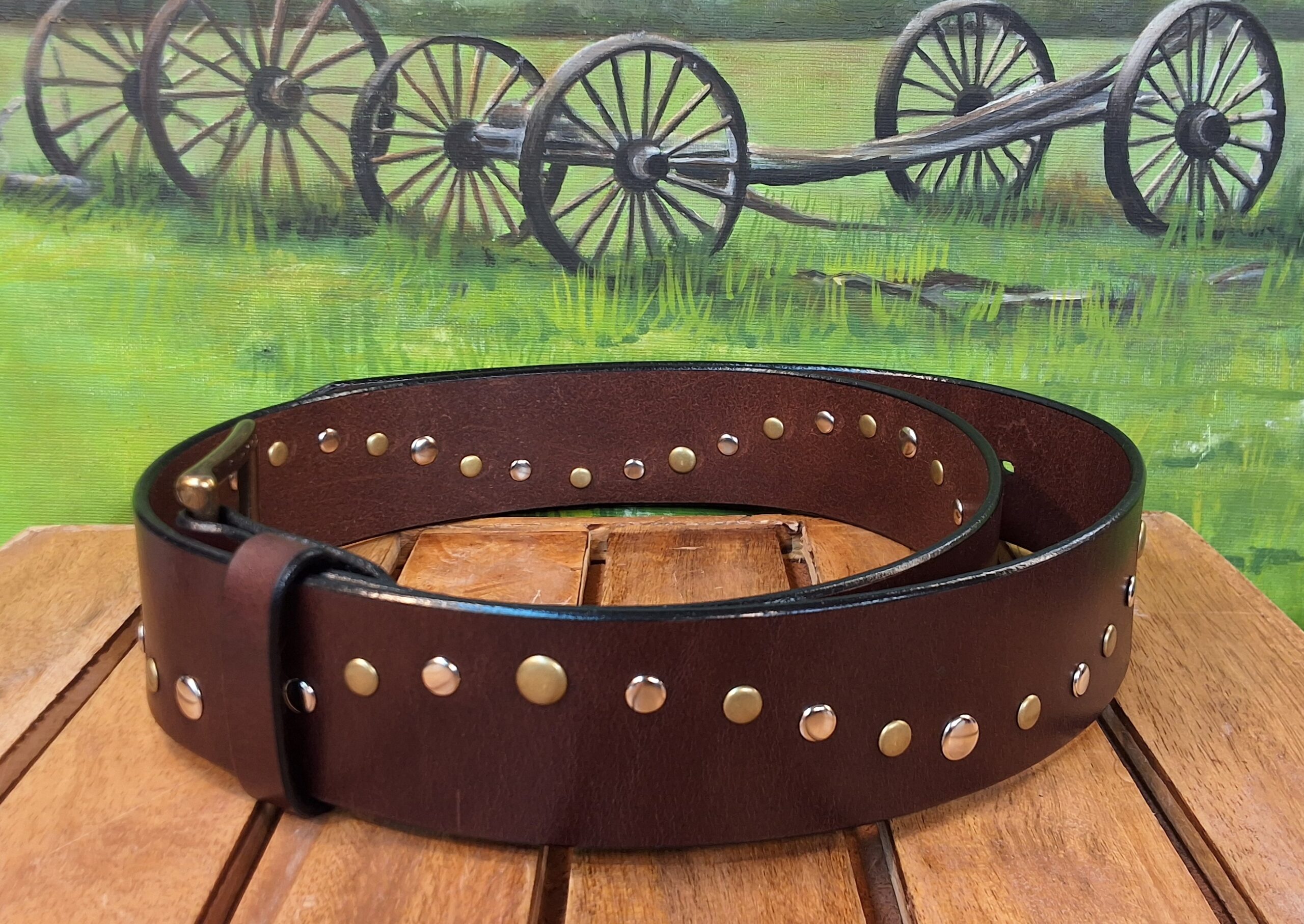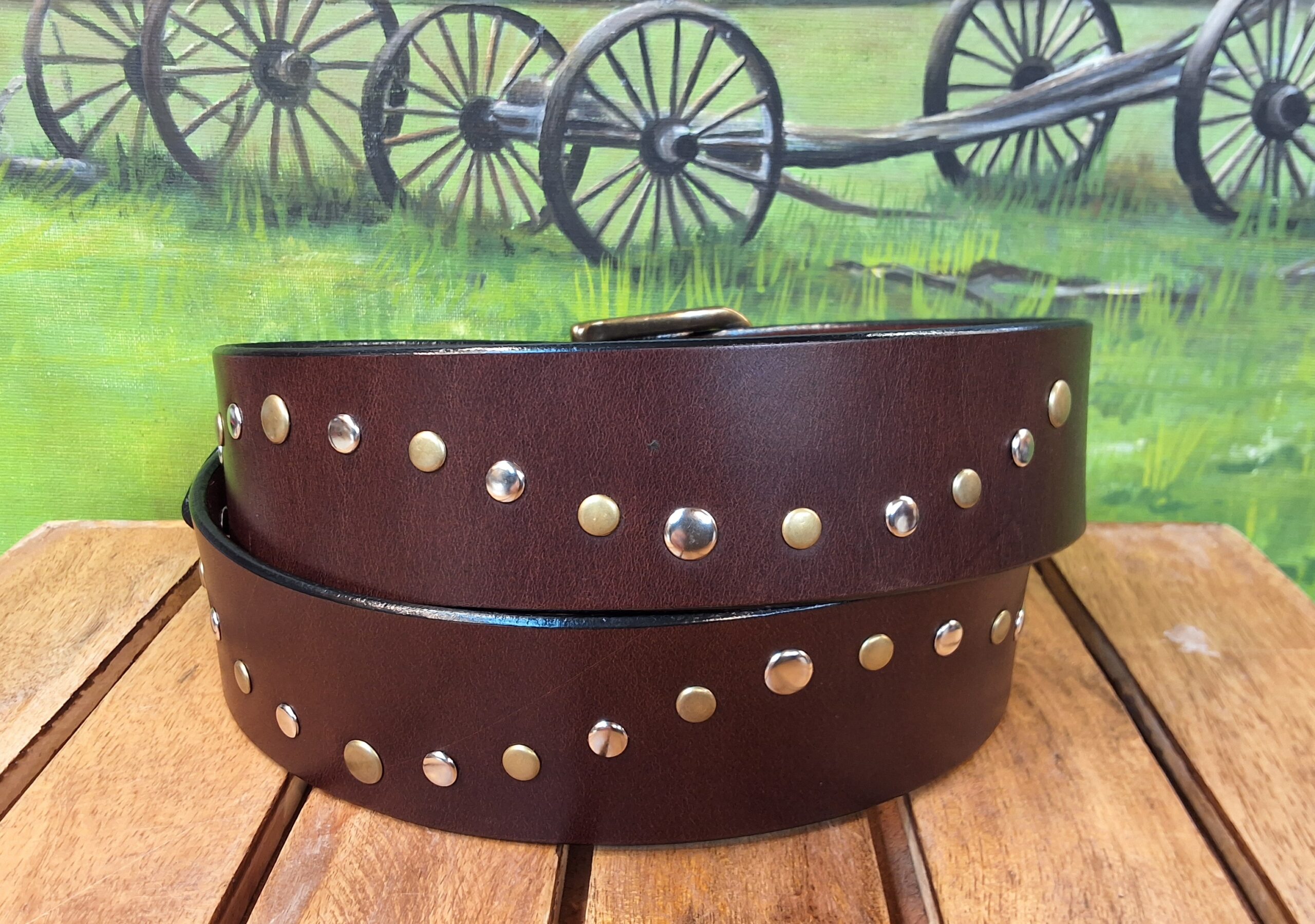 Featuring brass and or silver double capped rivets that are hand set and finished with a antique brass or silver buckle.