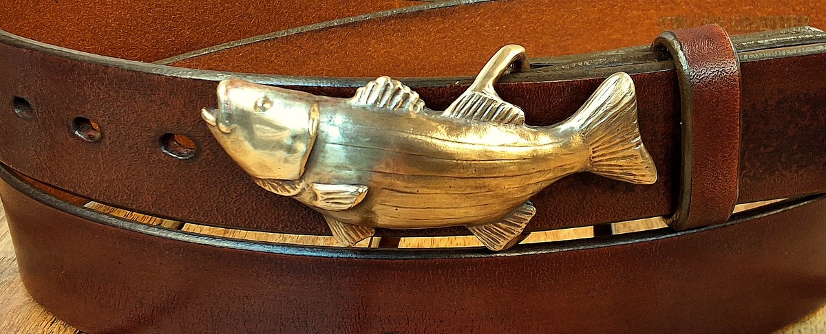 Our Striped Bass Profile Fishing Angler Buckle is designed by designer, Artist Taf Schaefer is Artisan fine quality locally handcrafted in Bronze metal to fit up to a 1-1/4″ width premium full grain natural veg tanned leather belt.