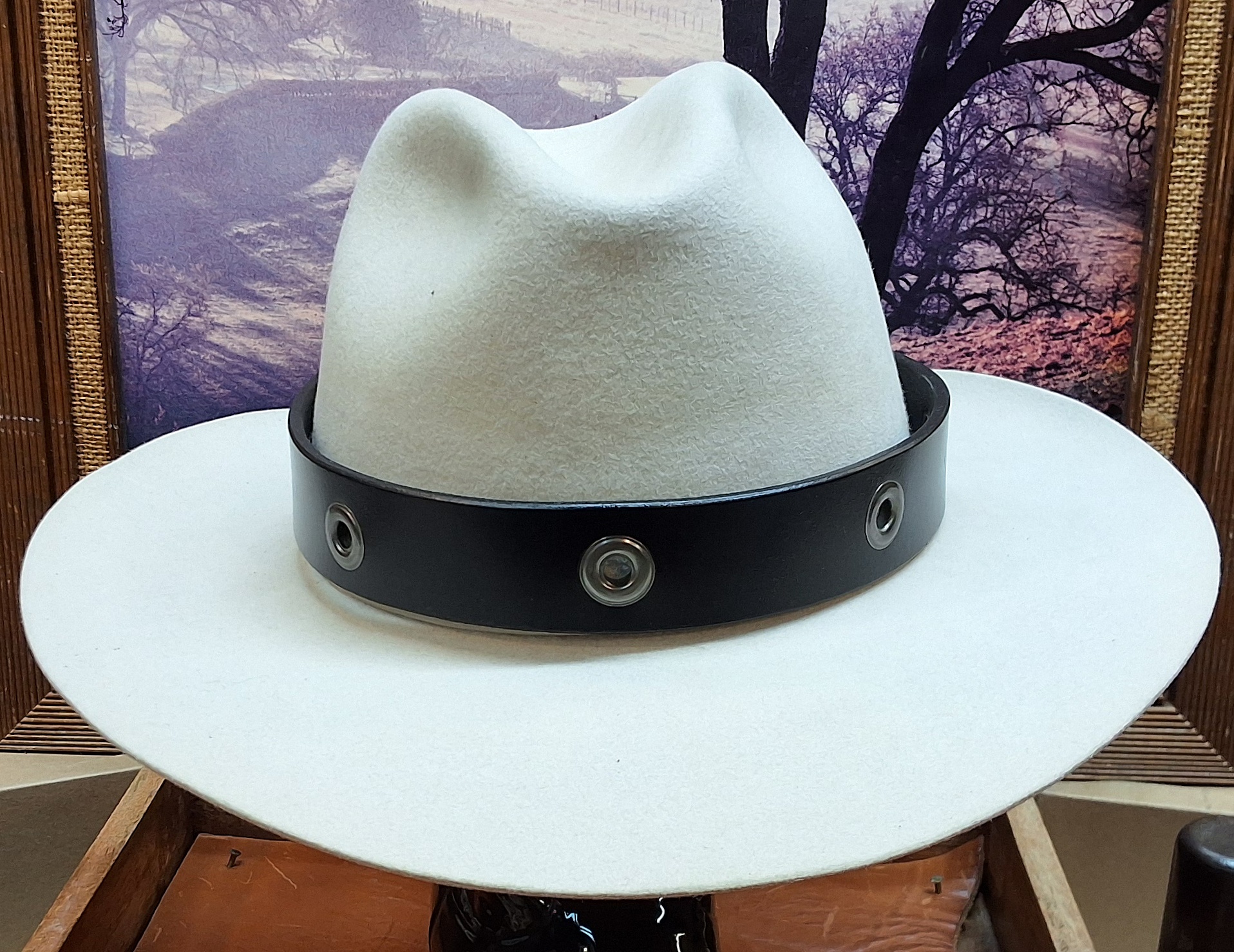 Our Artisan Handcrafted Black Eyelet Leather Hat Band features a -1/4″ width Hat Band crafted from traditional black English Bridle Leather.